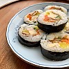사각 김 위에 밥펴, 단무지, 햄, 좋아하는 것 잔뜩넣고 돌돌 말아썰은 맛나는 김밥